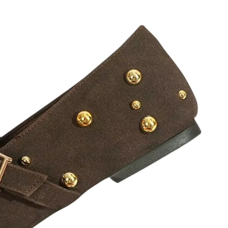 Deze dames ballerina’s combineren kunstsuède met metalen studs voor een opvallende uitstraling. Het Mary Jane-bandje met gesp zorgt voor een stevige sluiting en geeft het ontwerp een klassieke twist. De ronde neus en vlakke hak maken de schoenen praktisch en elegant tegelijk.