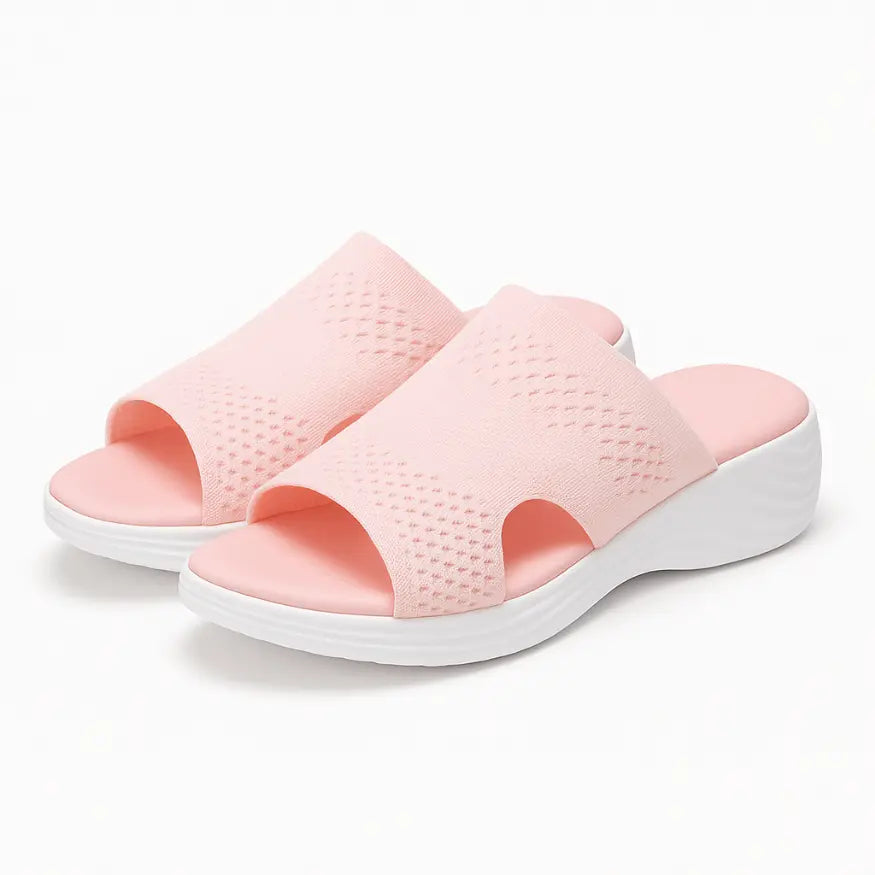 Deze luchtige sandalen zijn gemaakt van ademend mesh en bieden een comfortabele pasvorm met een zachte rubberen zool die elke stap dempt. Het instapmodel met open zijkanten zorgt voor een vrij gevoel rond de voet terwijl de subtiele sleehak extra steun geeft tijdens het lopen. Ideaal voor dagelijks gebruik of ontspannen momenten waarbij comfort en gemak centraal staan zowel binnenshuis als buiten.